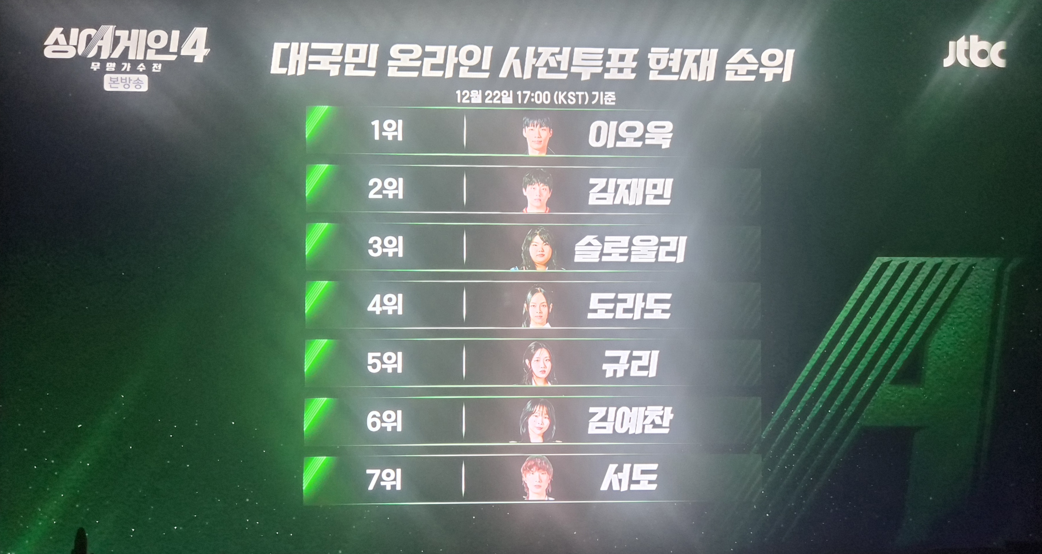 1위 이오욱 2위 김재민 3위 김규리 4위 서도 5위 김예찬 6위 도라도 7위 슬로울리